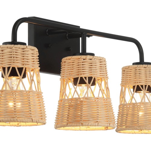 Moonlit – 3 Lights Wall Sconce With Shade, Bathroom Lighting Fixtures Over Mirror – Black / Rattan