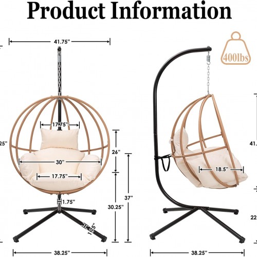 Egg Chairs with Stand, Egg Swing Chair Outdoor, Hanging Swinging Chairs with Stand for Balcony, Swing Egg Chair with Cushion 400LBS Capacity, Brown