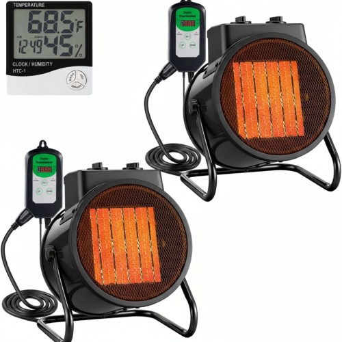 Greenhouse Heater with Thermostat & Hygrometer, 1500W/750W/24W Plant Heater Fan, Adjustable Temperature 40°F-108°F Patio Heaters for Outdoor Use Tents Winter Grow Garage Indoor(Black,2 Pack)