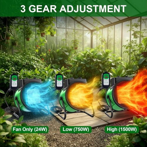 Greenhouse Heater with Thermostat & Hygrometer, 1500W/750W/24W Plant Heater Fan, Adjustable Temperature 40°F-108°F Patio Heaters for Outdoor Use Tents Winter Grow Garage Indoor(Green,1 Pack)
