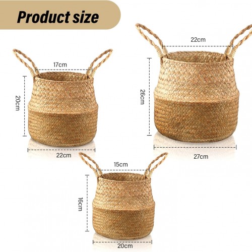 Patelai 3 Set Seagrass Belly Storage Basket Woven Plant Pot Holder with Handles for Plants Picnic Grocery Laundry(Natural Color)