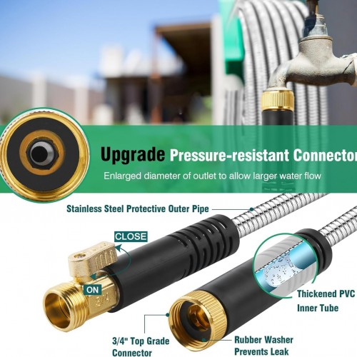 Metal Garden Hose 100Ft Stainless Steel Water Hose Heavy Duty with 10 Way Nozzle-Flexible Lightweight Durable No Kink & Tangle,Strong 3/4’’ Solid Metal Fitting a Stop Valve for Outdoor Yard