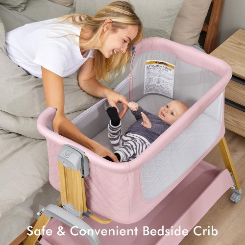 Bassinet Bedside Sleeper, Rocking Bassinets with Comfy Mattress and Wheels for Newborn, 5-Height Adjustable (Pink)