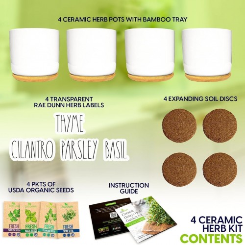 Deluxe Ceramic Indoor Herb Kit 4 Set. Variety Herbs for Indoor & Outdoor – Get Growing with Pots, Potting Soil for Window Herb Garden. (Ceramic Edition)