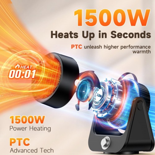 - Special Feature : 250Sq.ft Coverage, 2 Adjustable Heat Settings, 100° Customized Heating Angle, 30dB Noise Free Operation, 3.6Lb Ultra Lightweight, 5 Feet Power Cord, Quadruple Safety Protection: Tip-Over, Overheat, Protective Grille, UL Listed, Upgraded Motor, PTC Tech, 1500W High Power, 1S Fast Heating