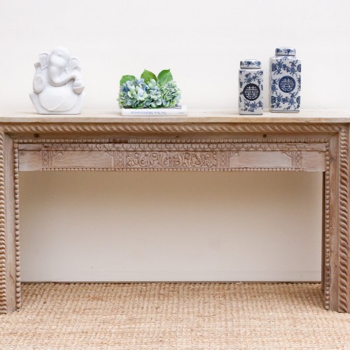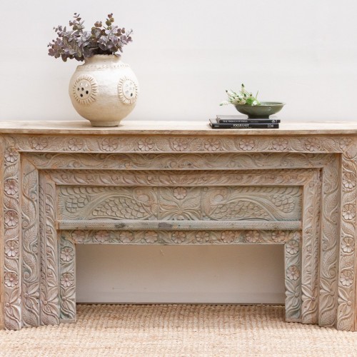 Imagine the grand entrance of an 18th-century Indian residence, above which this very panel once graced as an ornate over-door. Now reborn as a stunning 73-inch console table, it carries the whispers of history within its beautifully carved teak wood. The arched design forms a graceful silhouette, while the intricate floral and fauna carvings come to life, depicting majestic peacocks displaying their plumage, noble lions in repose, and gentle elephants amidst lush foliage. These carvings, executed with the skill of master artisans, tell stories of the natural world held sacred in Indian culture. The sun bleached patina of the wood adds depth and character, enhancing the authenticity of this remarkable piece.