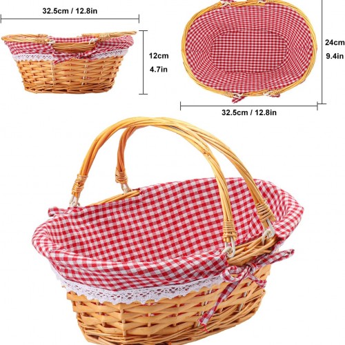 2 Pack 12.6 Inch Natural Wicker Basket with Checkered Lining, Oval Wicker Woven Basket with Handle, Willow Woven Picnic Baskets for Picnic, Camping, Party(Small)