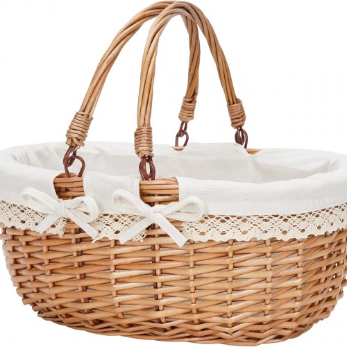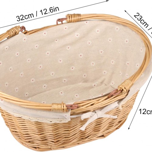 2 Pack Medium Size Oval Willow Basket with Handle, 12.6x9x4.7 Inch Wicker Picnic Basket with Liner, Empty Gift Basket, Wicker Basket for Fruit, Candy, Wine, Gathering, Wedding, Picnic, by GNIEMCKIN