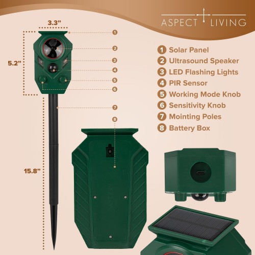 - Powerful Ultrasonic & Flash Deterrent – Advanced ultrasonic waves and flashing LED lights effectively scare away a wide range of animals without harming them. Ideal for protecting your garden, yard, or farm.