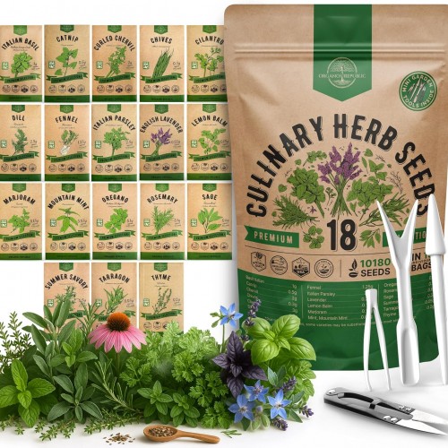 - Gardening Kit: 20 Culinary Herbs & Edible Flower Seeds Variety Pack NON GMO Heirloom Seeds LESS THAN $0.70 PER SEED VARIETY PACK 9500+ seeds including: Basil Italian, Basil Purple, Bergamot, Borage, Chervil, Chives, Cilantro, Dill, Echinacea, Fennel, Italian Parsley, Lavender, Lemon Balm, Mountain Mint, Peppermint, Oregano, Rosemary, Sage, Tarragon, Thyme.
