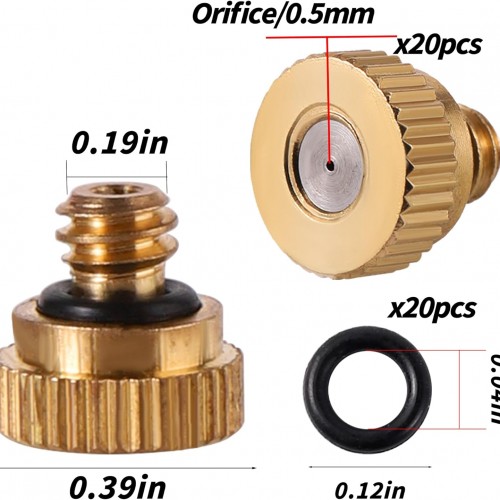 - PACKAGE INCLUDING: 20pc Brass Nozzles , 20pc Brass Misting Nozzles O Ring .40pc in total These are so much better evenly spray Mists the soil.(THE WATER PRESSURE OF 3 BAR CAN CONNECT 20-28PC BRASS MISTING NOZZLE KIT! IF YOU WANT TO CONNECT MORE. WATER PRESSURE WILL REQUIRE HIGHER REQUIREMENTS)