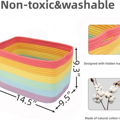 - 1, Medium to Large rectangle woven basket for storage: Our Rainbow rope basket with handles size is 14.5”X9.5”X9.3”. Designed as home storage basket for organizing or storage bins. Could use as cube storage bins,nursery bins,toy basket, pet basket, book basket, towel basket, clothes basket, nursery basket, wicker basket for storage and more. Perfect as storage basket for shelves or closet storage bins to store household items.