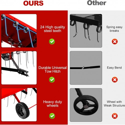- 🌸【Easy Installation】Spring and fall are the best seasons for raking, weed removal, and lawn repair. Choose our tow behind dethatcher for a hassle-free experience! We provide all the necessary accessories, and our installation guide on the homepage will walk you through each step. If you have any questions, feel free to contact us💌we’ll respond to Amazon emails within 24 hours.