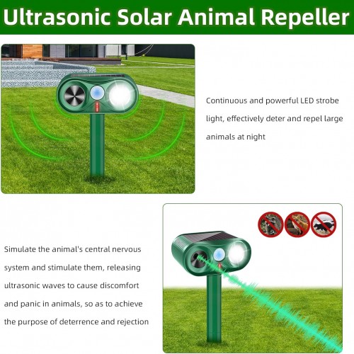 - EASY TO USE—Animal repeller portable and small size, simply insert the solar ultrasonic animal repeller into the appropriate soil where the light touches and turn on for functioning. For the first using, charge the solar panel in direct sunlight for 2 days. After assembling the cat deterrent, insert it into the area frequently disturbed by animals and having sufficient direct sunlight to keep the batteries fully charged, preferably about 9-10 inches above the ground.