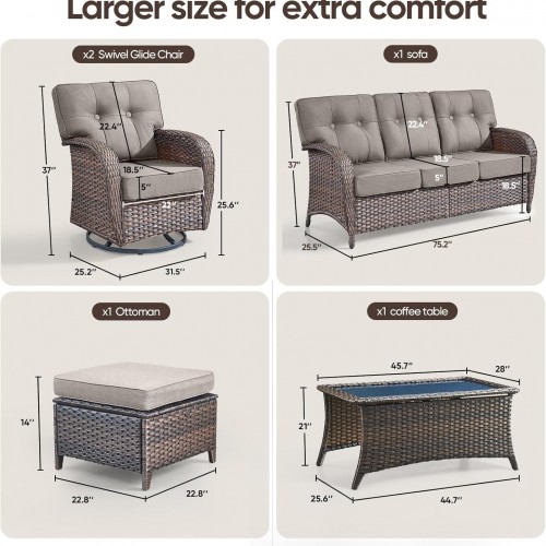 - 【Balcony Furniture Set Includes】: 6-piece balcony furniture set includes 2 swivel chairs, 1 glass coffee table, 1 sofa, and 2 footstools; the footstools can be used not only for resting your legs but also as a small table or stool. The swivel chairs can support up to 350 pounds