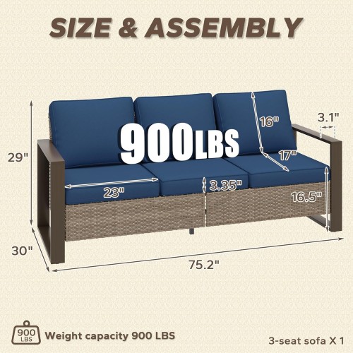 75″ Patio Metal Wicker Sofa, All Weather Outdoor Rattan 3-Seat Sofa Couch with Premium Cushions & Rectangular Framed Wood-Looking Metal Armrest for Garden Backyard Porch Deck, Dark Blue