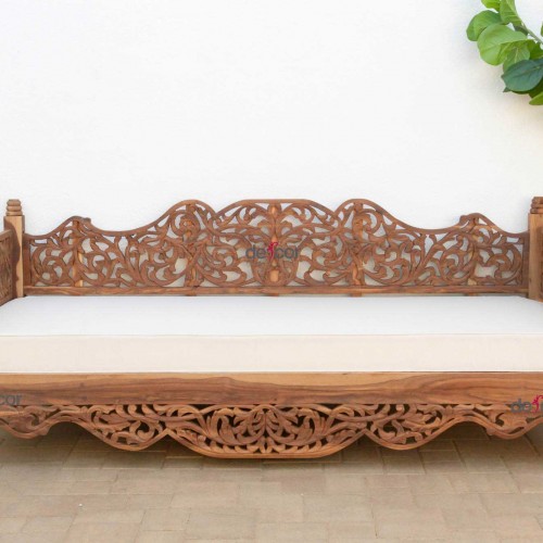 This daybed is crafted from old reclaimed teak wood and are hand-carved and handmade. Since the wood is reclaimed, it sometimes has natural cracks. Often, we fill these natural cracks with teak powder. These daybeds are very strong, and these cracks are not defects but natural characteristics of the old wood