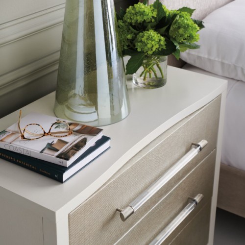A glamorous take on a casual style, this three-drawer chest introduces a refined mix of organic textures, materials, and metallic finishes. Raffia-wrapped drawer fronts in a Sun-kissed Silver bring to light the natural beauty and texture of this intricately woven material. Clear acrylic rod pulls capped in Satin Nickel finish the look with an element of distinction. Perfectly scaled for use as a hallway chest, oversized nightstand or focal piece along a wall beneath a favorite work of art.