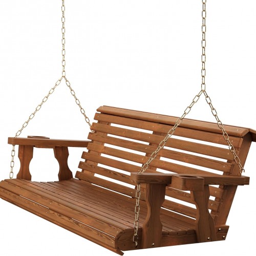 Amish Casual 5 Foot Roll Back Porch Swing with Cup Holders in Oak Stain – Amish Made in The USA from Treated Pine Heavy Duty 700 Lb. Weight Capacity