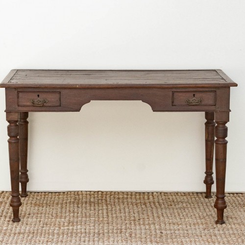 Exuding old-world charm, this British colonial writing desk boasts fine carved turned legs and a shaped apron kneehole. This antique desk features two functional drawers with traditional brass hardware. Crafted from teak wood, the desk’s lovely aged brown patinated finish, a testament to years of use and layers of wax, adds a touch of history to your home office or bedroom.