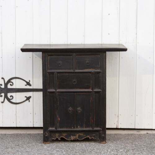 This fascinating Chinese money dresser is constructed from elm wood. Originally found in the Shanxi province, this cabinet features an ebonized finish, three drawers over two doors, an aged top, and iron pulls.