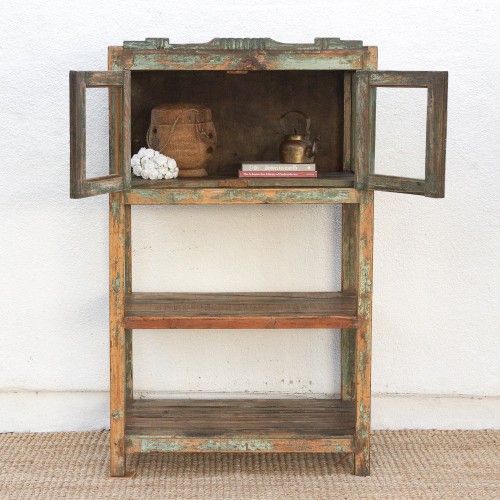 This handsome French Colonial étagère is a genuine antique, a charming fragment of history that effortlessly blends utility with old-world elegance. Dating to the early 20th century, this tall 60-inch high bookcase is defined by its beautiful, aged patina, which features pronounced traces of the original green painted finish. The charming cabinet section at the top is enclosed by double glass doors, perfect for showcasing cherished collections, while the two fixed slatted shelves below provide spacious, open storage. With its straight legs and decorative tray top, this antique wooden bookcase is a versatile piece. It serves as a charming display cabinet for a living room, a unique linen storage solution for a bathroom, or a distinctive kitchen hutch, bringing a touch of authentic rustic and Bohemian Colonial charm to any interior.