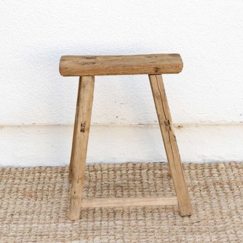 Full of age and character, this farmhouse style joint stool has a weathered look. This antique Asian stool has a stretcher base with distressed bleached finish. A rustic small end table for a living room or bedroom. Shows wear and oxidization.