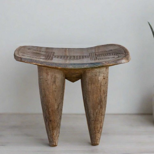 An antique tribal carved senufo table with a concave top that can be used as a side table or as a stool. It features a hand-carved turtle with a geometric tribal border all around. This antique table is carved from a single log of wood and stands on four solid tapered legs. This stool has a worn aged worn brown patina.