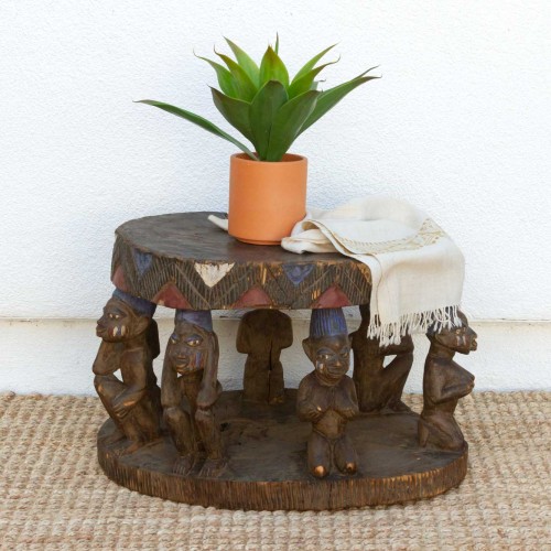 A stunning piece of African art, this antique Shango pedestal is a must-have for collectors and enthusiasts of Yoruba culture. Originating from Nigeria, these objects were traditionally placed on altars dedicated to Shango, the Yoruba god of thunder. Crafted from dense wood with excellent carved work, this pedestal feature Shango or his devotees, along with his iconic double-headed axe. As one of the orisha, or gods, Shango is believed to control the great powers of nature.This heavy, inverted mortar-like objects are not only unique artifacts but also functional pieces that can be used as stools or small end tables. Their distinctive appearance and cultural significance make them a perfect addition to any home or collection.