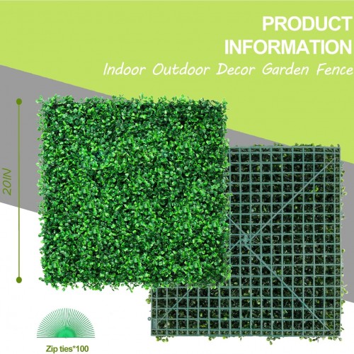 - 【Realistic & Thick Artificial Hedge】 Each package has 24pcs 20×20 inch artificial boxwood panels, total coverage area of 66.6 sq.ft. The thickness of the greenery backdrop is 2 inches which looks more realistic. The thick hedge is dense and can cover the background well and privacy. Bonus: 100 extra zipper tapes for easy and cost-effective installation