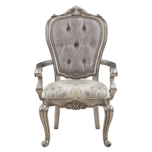 Introducing our Ariadne armchairs that are sure to captivate you with their intricate scrollwork and luxurious antique platinum finish. These stunning dining chairs have beautifully crafted scroll legs that make a grand statement on their own. Adorned with a subtle crown on the top of the frame and finished with crystal-like buttons on the backrest for visual appeal. The foam seat cushion creates the perfect set for your dinner guests to enjoy a nice meal.