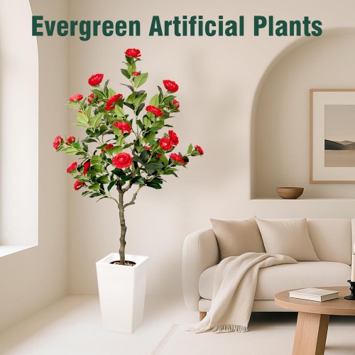 Artificial Camellia Tree 5FT, Red Flower Tree in White Pot, Faux Outdoor Indoor Plant, Potted Artificial Flower for Home Office Housewarming Porch Decor (61” Height)