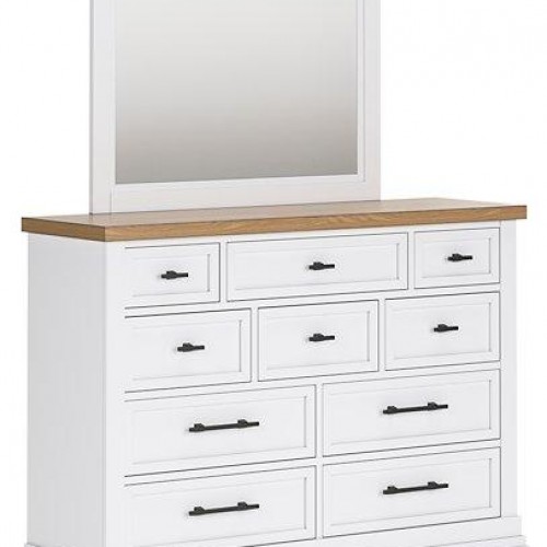 Casual style with substance. This two-tone dresser raises the bar on comfortably cozy design in your soothing sanctuary. A sturdy silhouette with a classic white finish and black metal hardware exudes modern farmhouse vibes. The butcher block oak veneer top adds a relaxed aesthetic. And this charmingly curated piece is spacious enough for all your essentials.