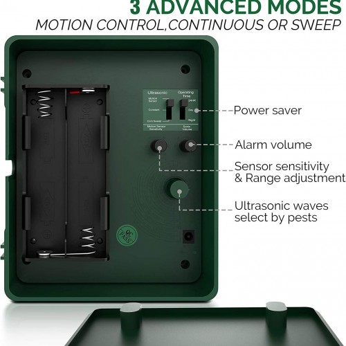 - 【Easy to Use】Includes the option to set Day, Night or 24-Hour protection for your garden, lawn, cabin, shed, attic, farm, barn, warehouse, patio or wherever safe and effective pest control is needed. Please read the instructions before installing, the ultrasonic sound emits in a forward direction from the device with a range of about 170 degrees horizontal and 60 degrees vertical.