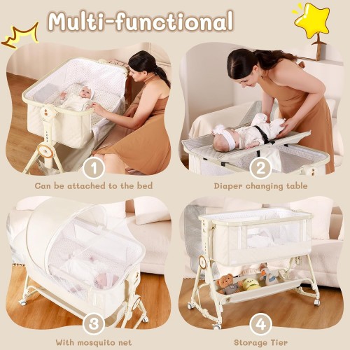 - HIGH STABILITY AND VERSATILE USAGE: Featuring A Sturdy Three-Legged Structure On Both Sides, This Bedside Bassinet Ensures High Stability. The Rocking Feature Can Be Easily Activated By Flipping The Wheels, While The Five Modes Including A Changing Station, Rocking Bassinet, And Sunshade Mosquito Net Provide Versatile Functionality To Cater To Your Baby’S Different Needs.