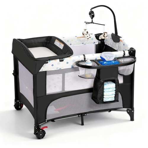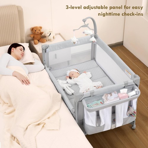 Baby Bassinet Bedside Crib, Pack and Play with Mattress, Diaper Changer, One-Push Setup Playards from Infants to Toddlers (Grey)