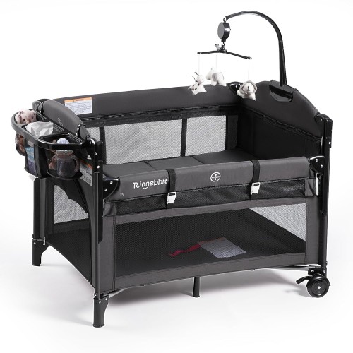- Convertible 4-in-1 Baby Bassinet – For newborns to 6-month-olds, the best place for that sleep is in a safety-certified bassinet, portable crib, or play yard in their parents’ room. Rinnebbit baby bassinet combines all the above demands in a nursery furniture. From practical bedside sleeper to changing table with storage basket, traditional baby crib/bassinet, all-side view playpen, it offers your baby a secure surface and place at early stages. The top-mounted music box with three cute animals creates a harmonious sleeping atmosphere. Turn on the switch and rotate the spring, and it will swivel automatically.