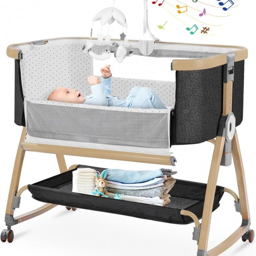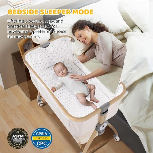 - EASY TO MOVE: The baby bedside sleeper is equipped with four wheels on the bottom, allowing the bassinet with wheels to be moved freely around the home. The casters are fitted with an automatic locking device that locks all the wheels to rest securely without accidental sliding. The four wheels flip upwards, instantly converting into a bassinet, and the slight rocking from side to side helps baby fall asleep faster.
