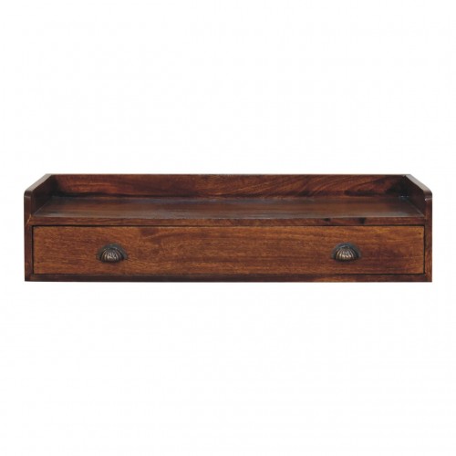 - Artisan Furniture Solid Wood Belmont Wall-Mounted Console Shelf – Crafted from 100% solid mango wood with a chestnut finish, the Belmont Wall-Mounted Console Shelf combines elegance with practicality. This refined piece features a spacious single drawer adorned with two antique-style shell brass handles, providing a touch of classic charm. Perfect for entryways or living spaces, it saves floor space while adding a warm, sophisticated accent to your decor. Ideal for storing essentials within reach, the Belmont Console offers both style and functionality.