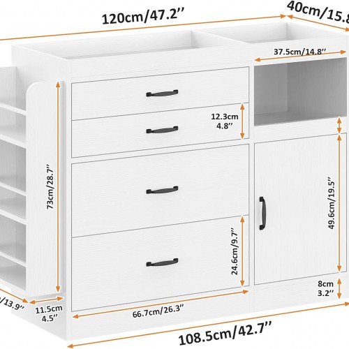 - All-in-One Nursery Dresser: This versatile piece combines a diaper changing station, a 4-drawer dresser, a closed cabinet, and 3 open bookshelves—everything you need to organize your baby’s nursery in one sleek unit. No more cluttered spaces; keep diapers, wipes, clothes, toys, and bedtime stories all within arm’s reach.