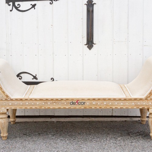 Fabulous Anglo Indian inlaid chaise lounge featuring shaped sides and traditional turned legs. This piece is entirely adorn with beautiful floral motifs all around and upholstered in a hand-woven cream fabric. Textiles and pillows shown are not included. Seat 18″ (H)