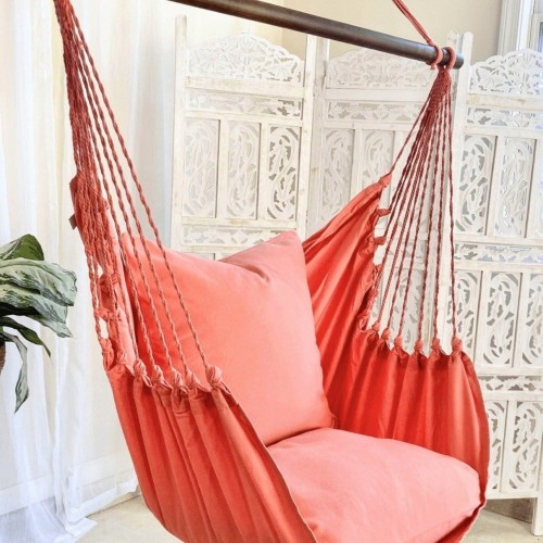 This luxury hammock chair is handmade in El Salvador from premium 100 % woven cotton using a traditional artisanal process. Made exclusively in a fair trade environment by artisans who have been perfecting the craft for centuries.