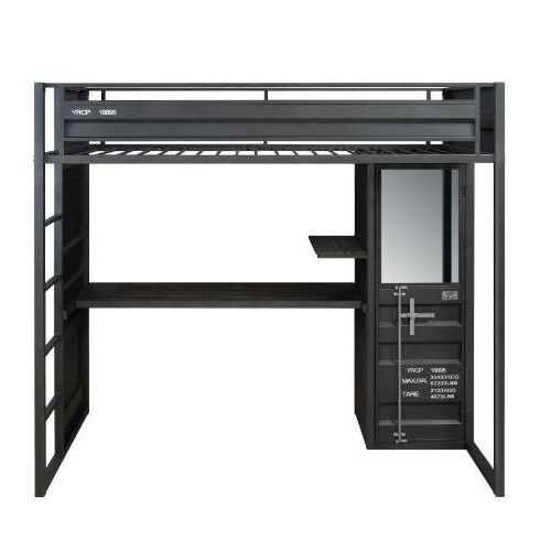 This Cargo storage loft bed will stand the test of time with its metal framework and unique shipping container design. The built-in wardrobe, desk, and shelf are conveniently designed to save space and maximize the use of smaller bedrooms. The gunmetal finish is a neutral color that makes it easy to style around. All case good pieces offer spacious drawers perfect for all your storage needs. Finish off the look with the matching chair and mirror.