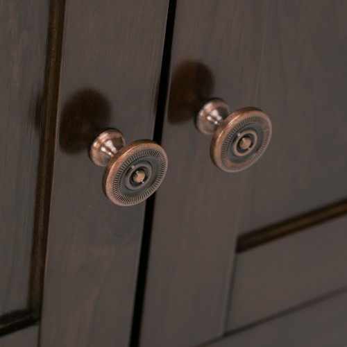- Transitional design includes defined double molded top, tapered table legs, rounded decorative knobs and shaker style doors