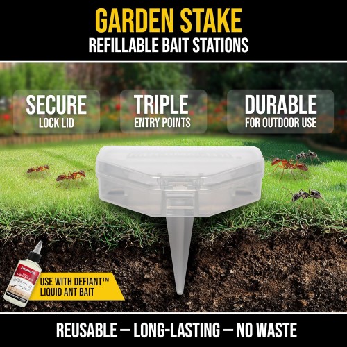 - ANT BAIT NOT INCLUDED – DESIGNED FOR MAXIMUM INFESTATION CONTROL: Use with DEFIANT Liquid Ant Bait (sold separately). These reusable outdoor ant traps effectively deliver ant killer bait, eliminating the queen and the colony. Designed with a sturdy stake, the station will stay-put, even in harsh weather conditions. Place directly into soil, mulch, garden beds, or in potted plants indoors. The triple-entry design allows for maximum ant access for fast ant elimination.