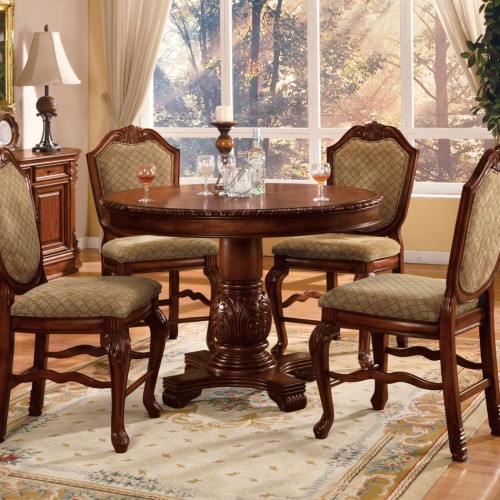 The Chateau de Ville Traditional Dining Collection features elegant styling decorative carvings and a combination of hardwood and veneers. The pedestal dining table, upholstered chairs are all accented by decorative base and shell motifs. Matching Hutch & Buffet reflects all carefully selected design features as the dining collection. This collection will be the showpiece of your dining room environment.