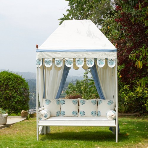 Featuring a traditional bouquet of Indian flowers block print fabric overhang and a painted metal frame, this canopy daybed has a very tall cone-shaped ceiling, giving it a royal bohemian look. This De-cor exclusive design was constructed by skilled artisans in Northwest India using a strong iron frame and waterproof canvas, making it suitable as a garden daybed or patio seating.