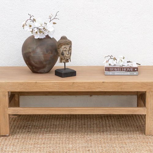A piece that carries the warmth of the sun and the soul of the earth. Crafted from sturdy old elm wood, this coffee table is defined by its stunning sun-bleached finish. This luminous, weathered patina tells a story of its own, highlighting every unique grain and knot while giving the piece a serene, weightless feel. The design is a study in classic simplicity, with a substantial top and solid legs connected by a central stretcher, providing a powerful anchor for any room.