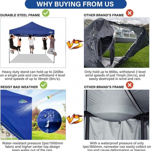 - 【Heavy Duty Alloy Steel Frame】The upgraded 10×10 commercial pop up canopy tent frame can hold up to 220 lbs (100 kg) on a single pole. The frame can hang 5 adults at the same time! Can withstand 4 winds.(<18 mph). 10×10 party tent with an upgraded alloy steel full truss structure, and reinforced plastic parts at the stress points at the intersection of the peaks and poles. 10×10 heavy duty canopy frame with powder coated coating guarantees rust resistance and corrosion resistance.