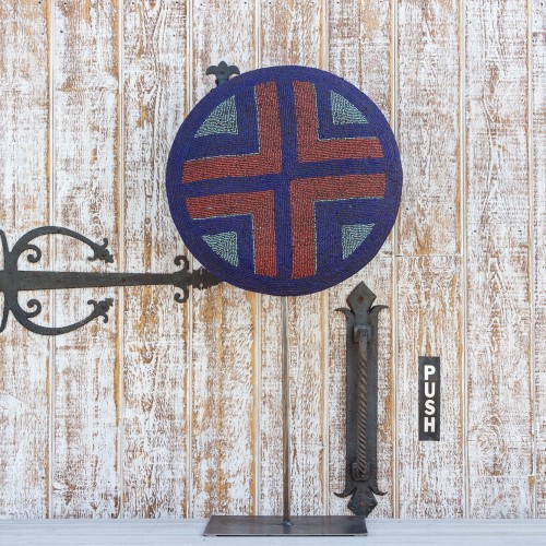This intricately beaded and colorful African round shield is hand-crafted from African hardwood. It features heavily beaded designs done with glass beads in red and blue. Originally these shields were used in ceremonies, they symbolize protection for a family against bad energy. This shield has been beautifully mounted on a solid custom designed stand.